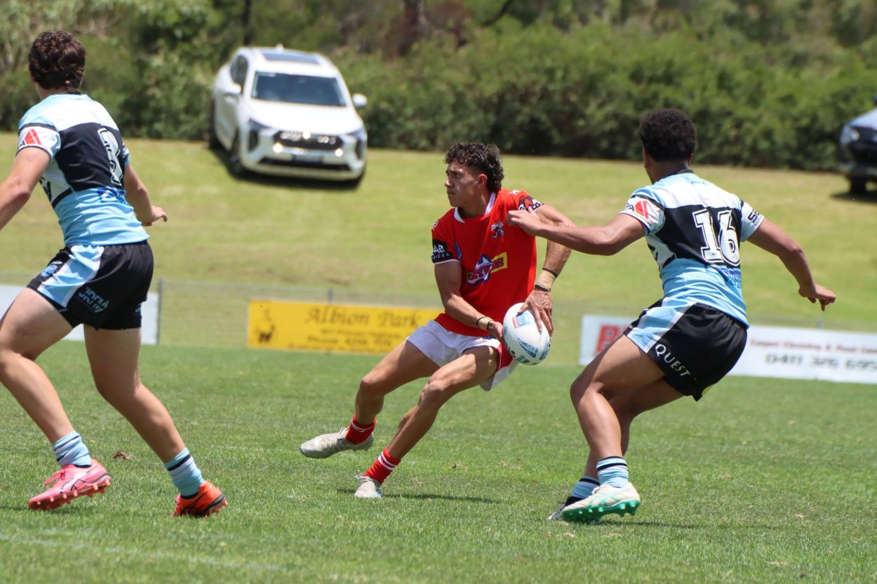 Pictured: LDC Fullback Jarrah Thomas looks to offload during a pre-season trial against the Sharks.